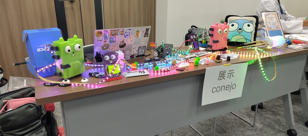 まずは _CONEJO さん。 TinyGo の中の人であり、海外の GopherCon や FOSDEM などでも実際に展示されているものを多数持ってきていただきました。にぎやか。