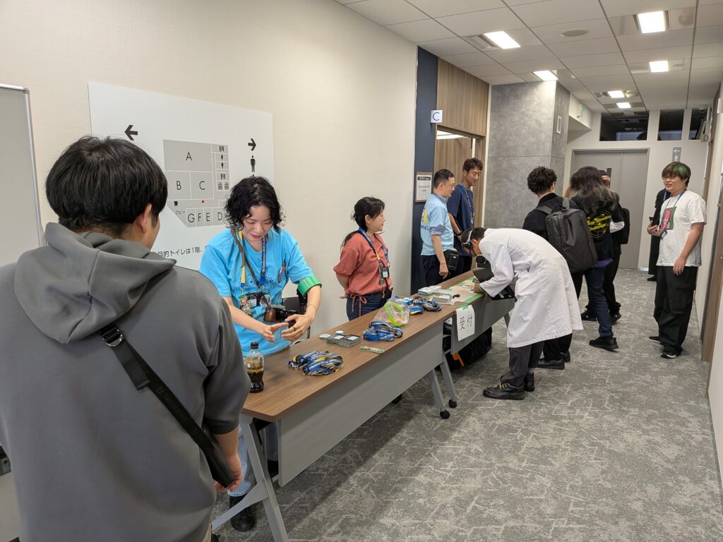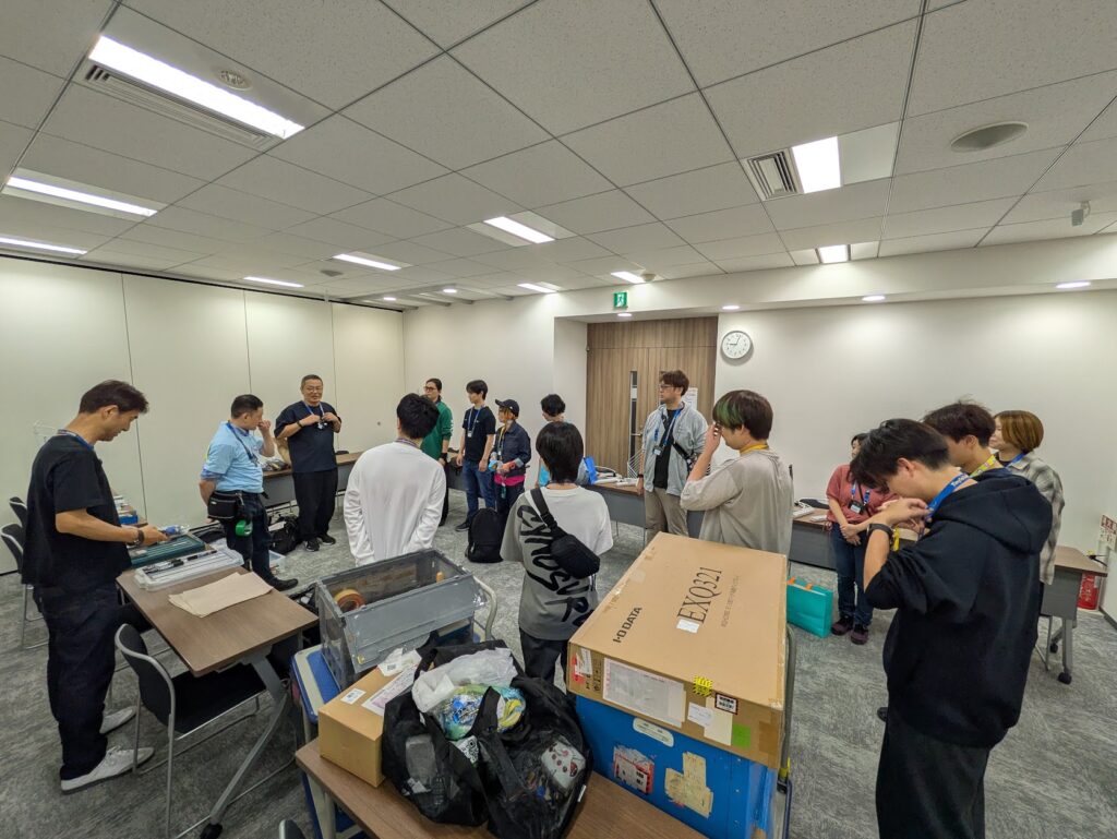 09:00 前に現地入りし準備をしていきます。はんだ付けを伴うワークショップがあったり大がかりな展示があったりで時間がかかることが予想されるため、手短にスタッフミーティング + スタッフ自己紹介を済ませていきます。