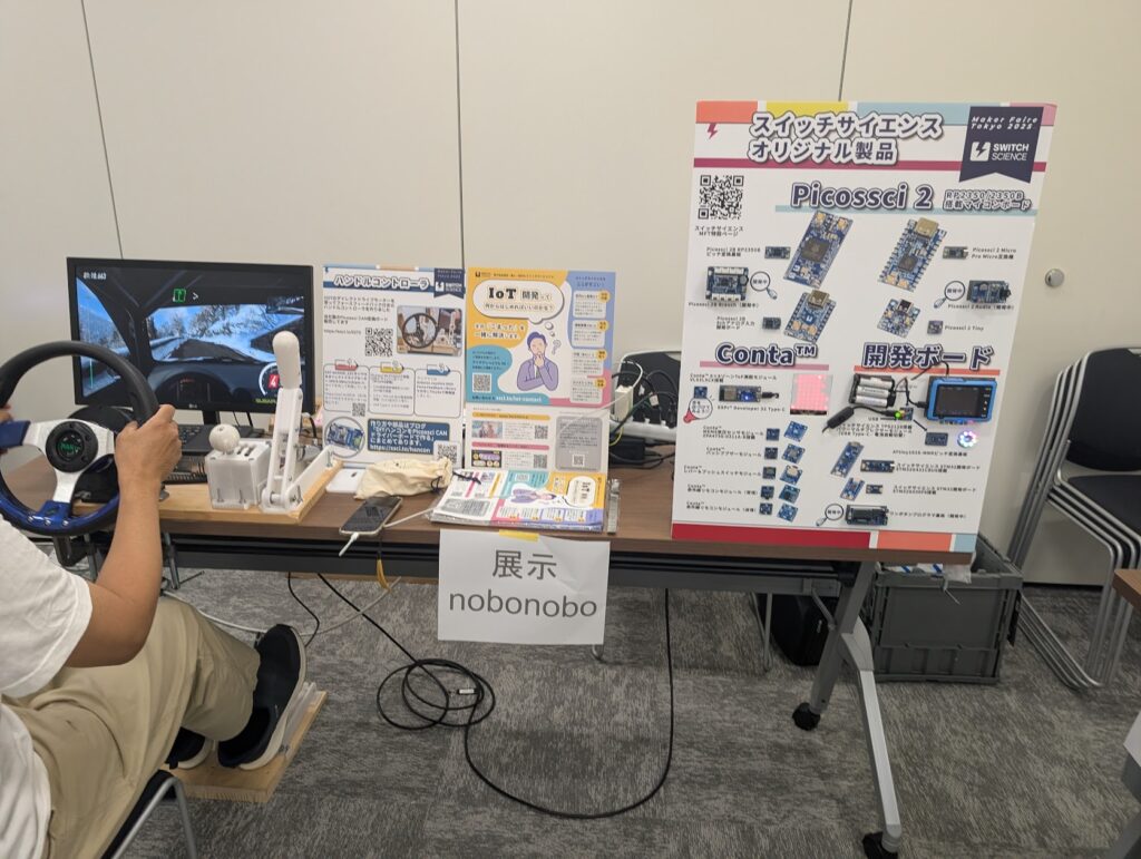 こちらは nobonobo さん / スイッチサイエンスさんの展示。 TinyGo で作成されたフォースフィードバック付きのハンドルコントローラーおよびペダル、シフトなどが実際にプレイできる形で展示されています。この写真とは違うゲームになりますが、多くの来場者に実際に体験していただきました。