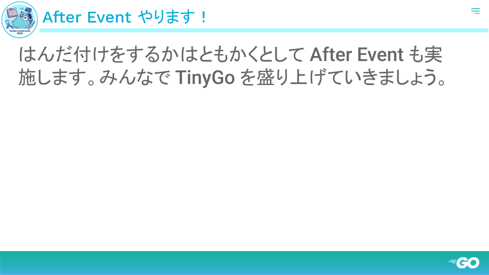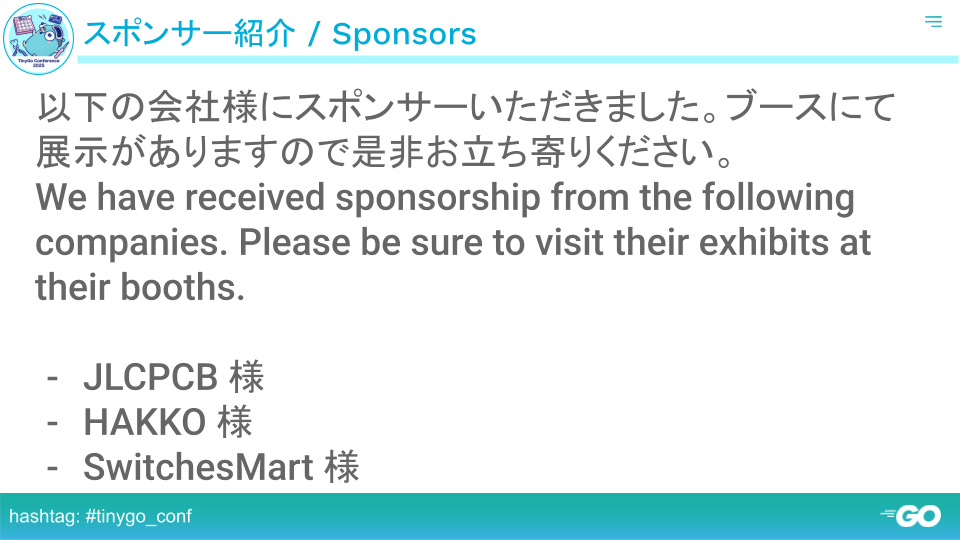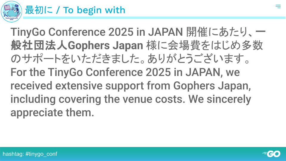 2025/10/12 に開催された TinyGo Conference 2025 in JAPAN は、皆様のおかげをもちまして、大盛況のうちに閉幕いたしました。ご参加いただいた皆様、誠にありがとうございました。